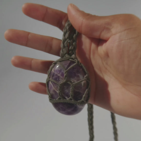 Channel the energy of intuition and transformation with this unique handmade necklace, featuring a large polished amethyst oval cabochon, cradled in intricate waxed macramé thread. Every knot is hand-tied with care, showcasing the dedication and skill of true artisan craftsmanship.