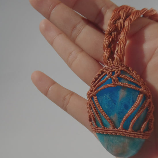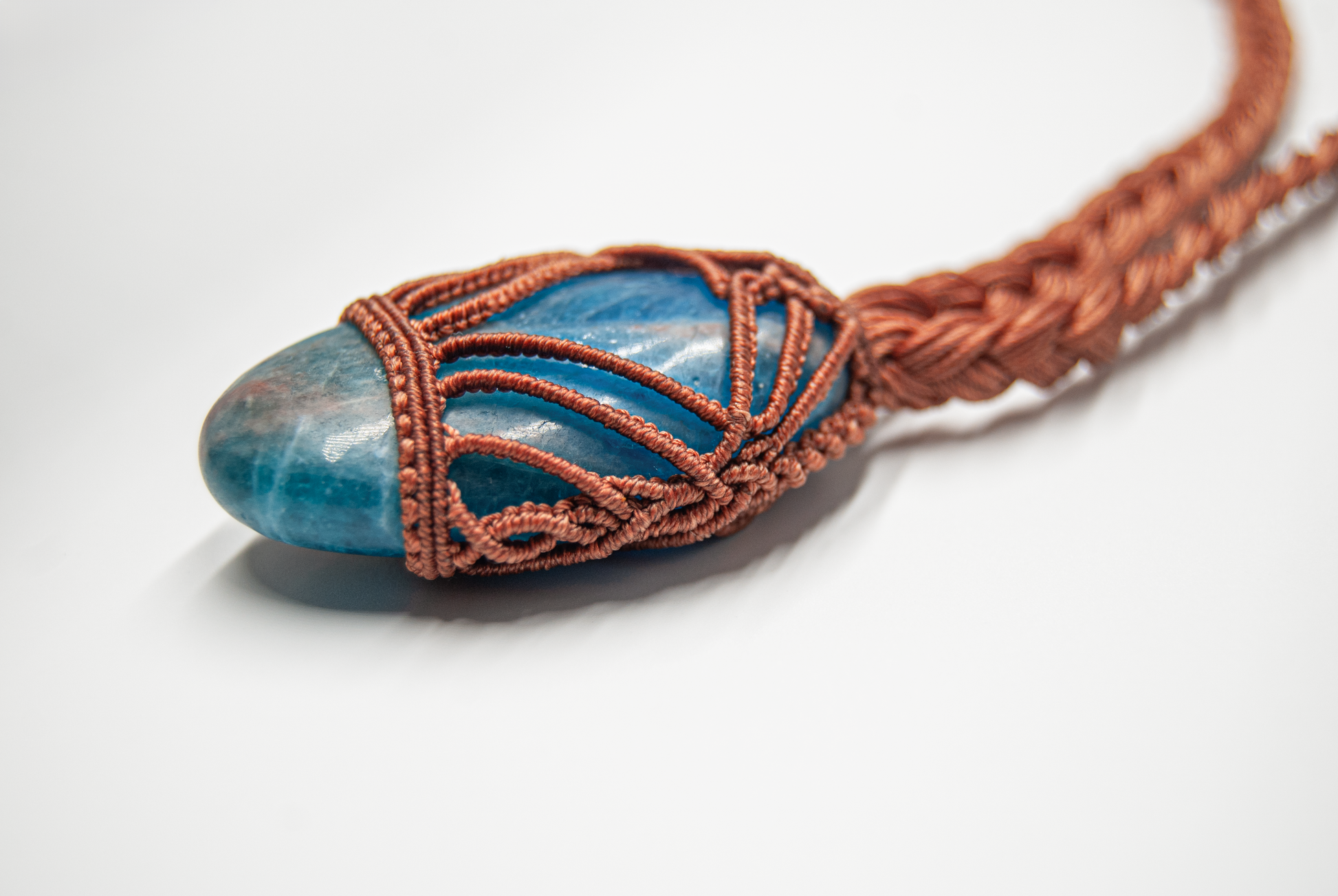 Elevate your everyday with this unique handmade necklace, featuring a polished Apatite oval cabochon delicately wrapped in waxed macramé thread. Every knot and curve is shaped by hand, a result of intricate artisan work and mindful attention to detail.