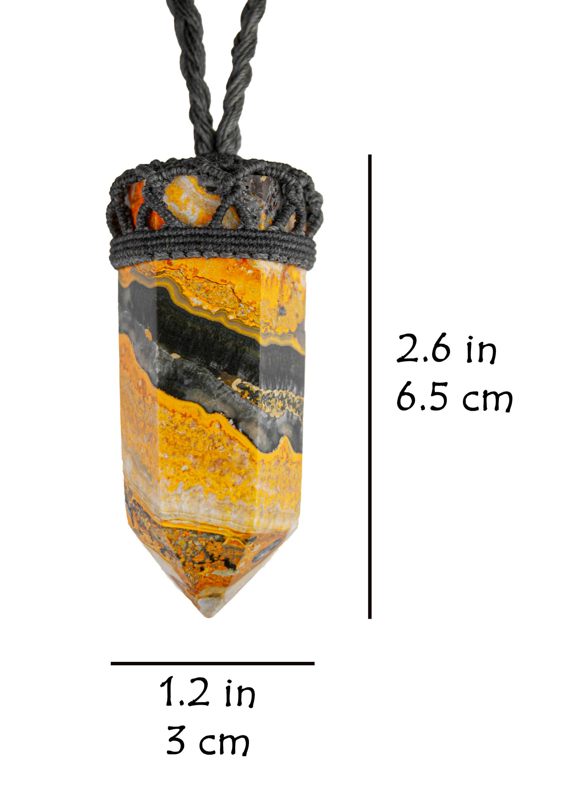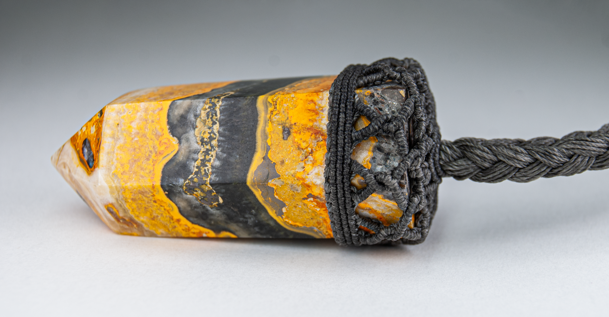 This striking handmade necklace features a natural bumblebee jasper point, securely held in an intricate hand-knotted macramé setting made with dark gray waxed thread. The stone’s dramatic bands of golden yellow, charcoal black, and earthy gray create a powerful visual contrast—bold, grounding, and unmistakably elemental. The structured knotwork forms a protective crown around the top of the pendant, emphasizing both stability and intentional craftsmanship.