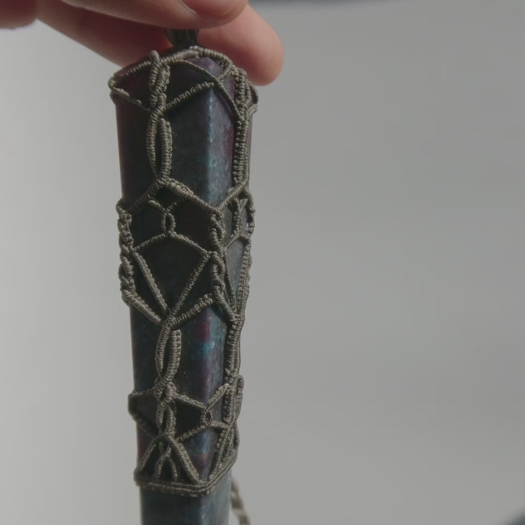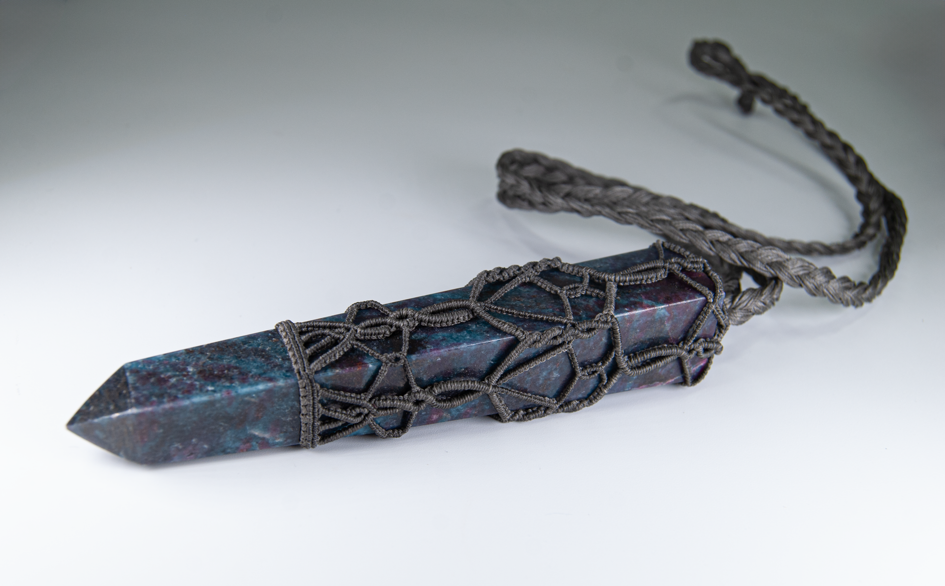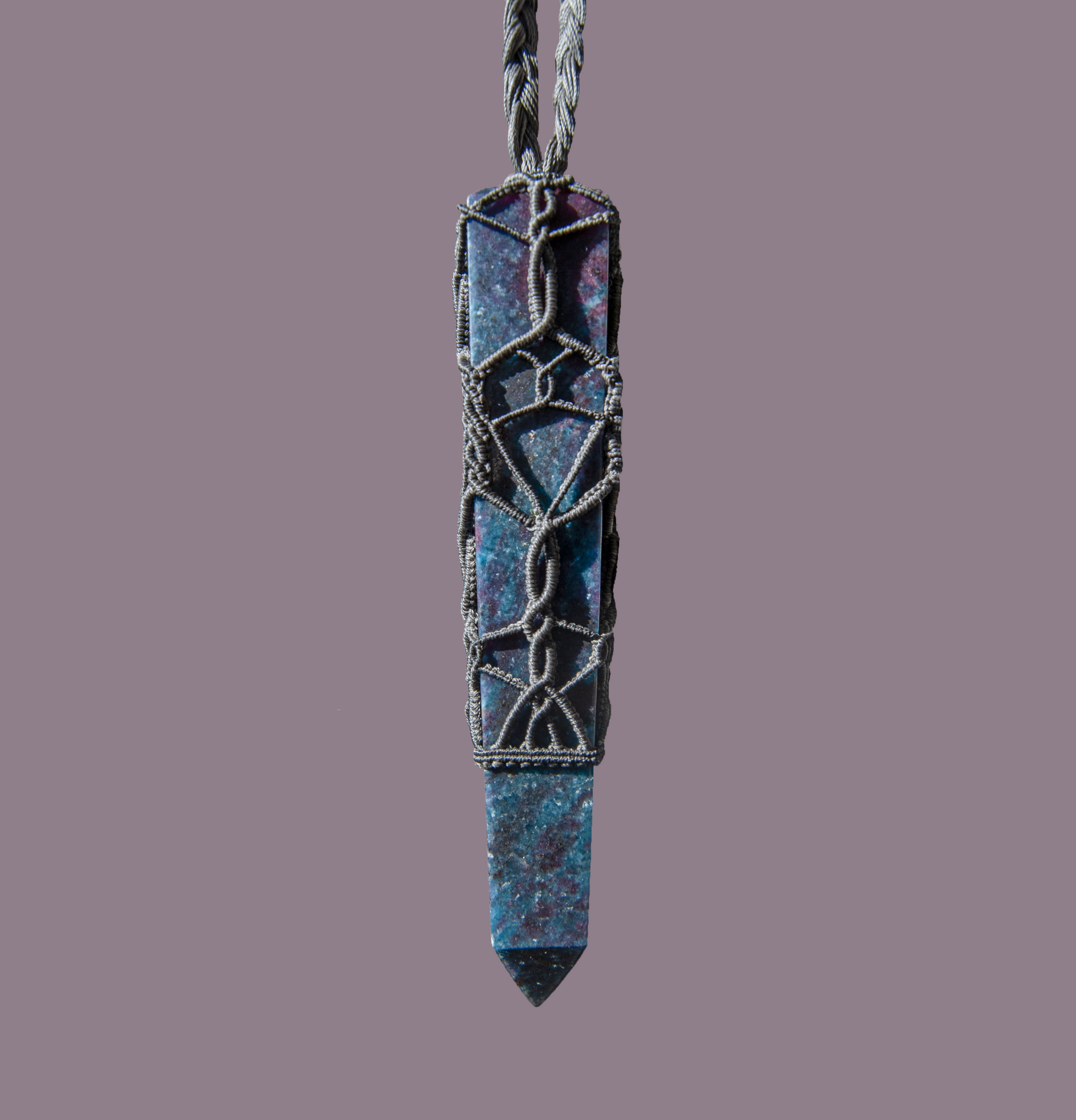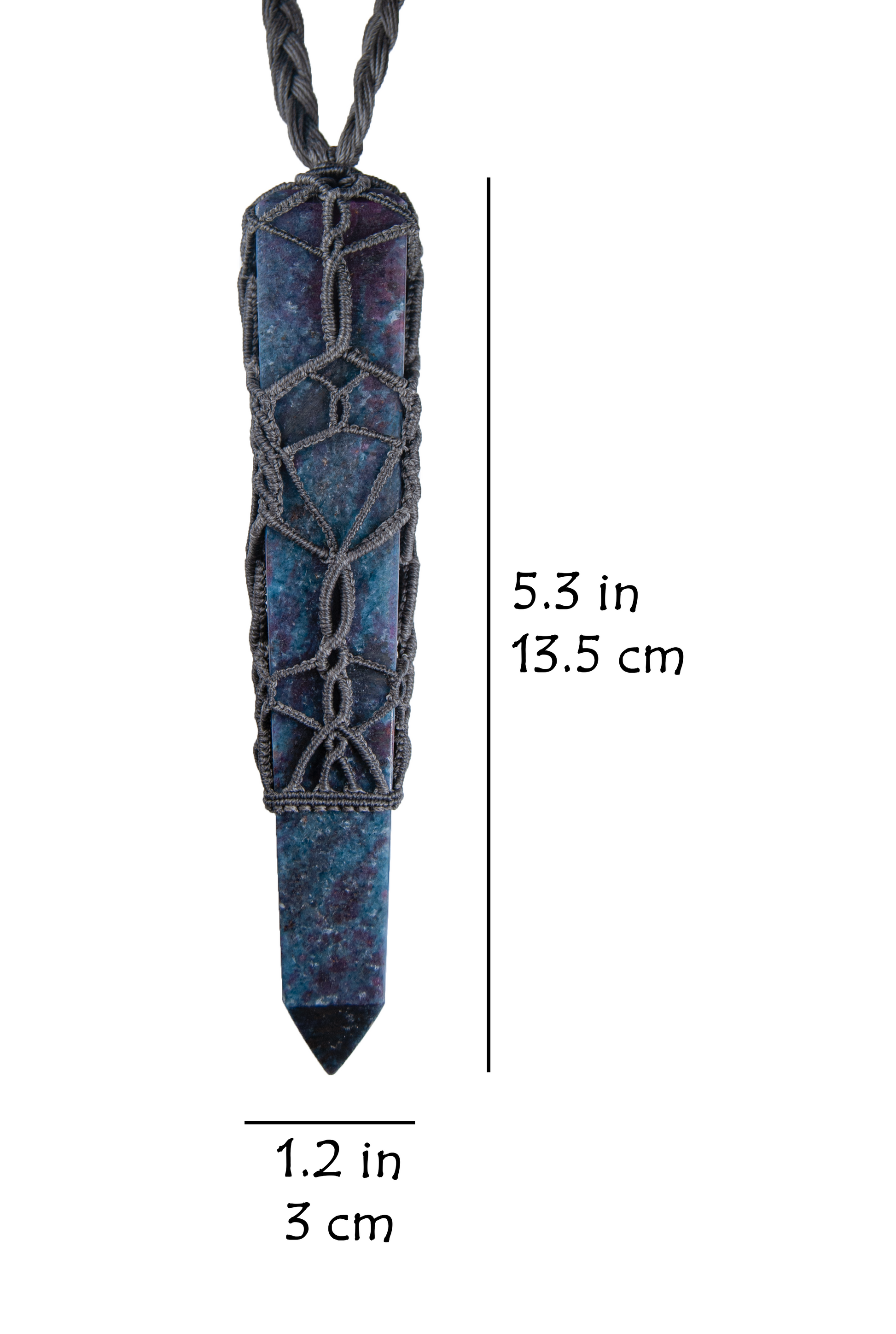 This striking handmade necklace features an extra-long Ruby Kyanite point, meticulously wrapped in durable, waxed macramé thread. Its tall, elegant shape draws the eye while channeling a powerful blend of grounding and passion—an exquisite harmony of energies brought to life through detailed artisan craftsmanship.