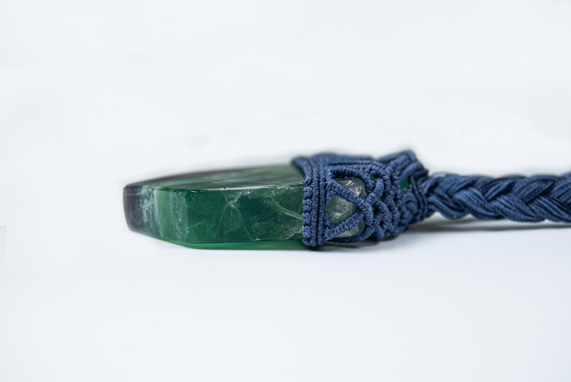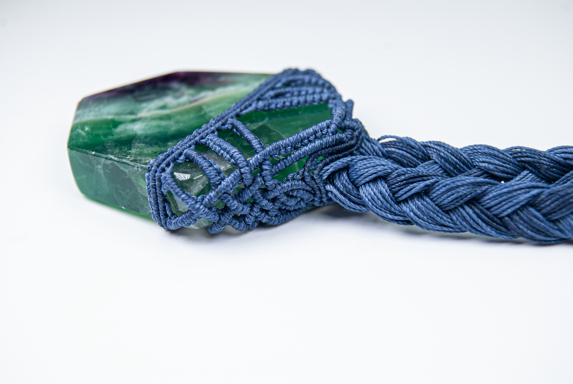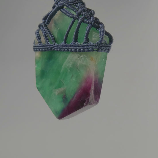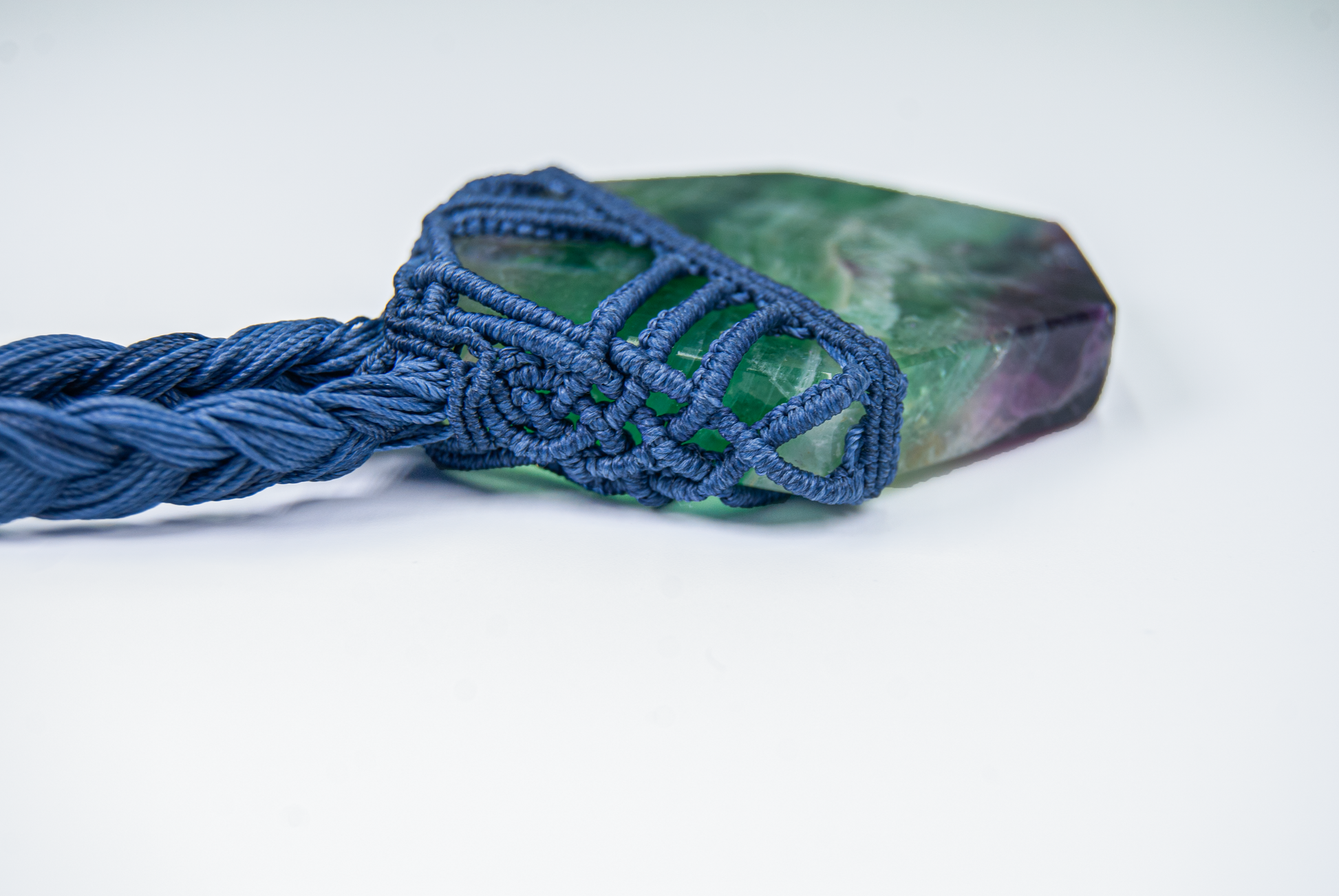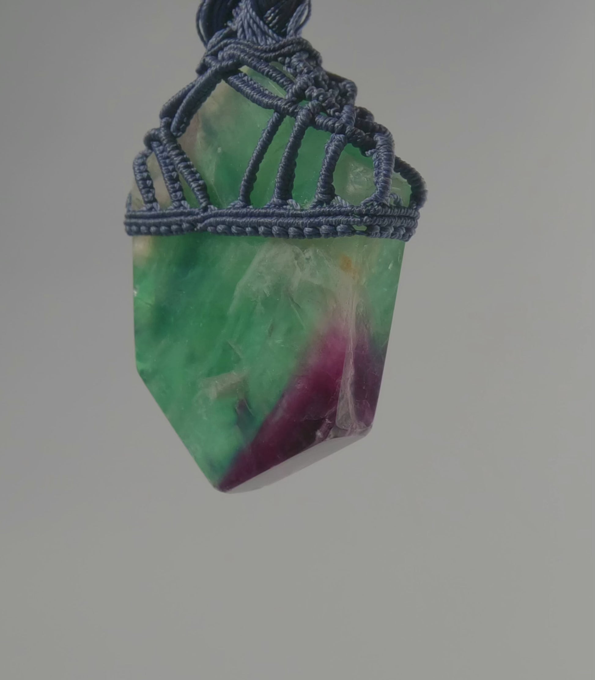 Elevate your energy with this unique handmade necklace, featuring a polished natural fluorite stone in stunning green and purple hues, expertly wrapped in dark blue waxed macramé thread. Crafted with intricate artisan precision, this statement piece blends beauty and spiritual power effortlessly.