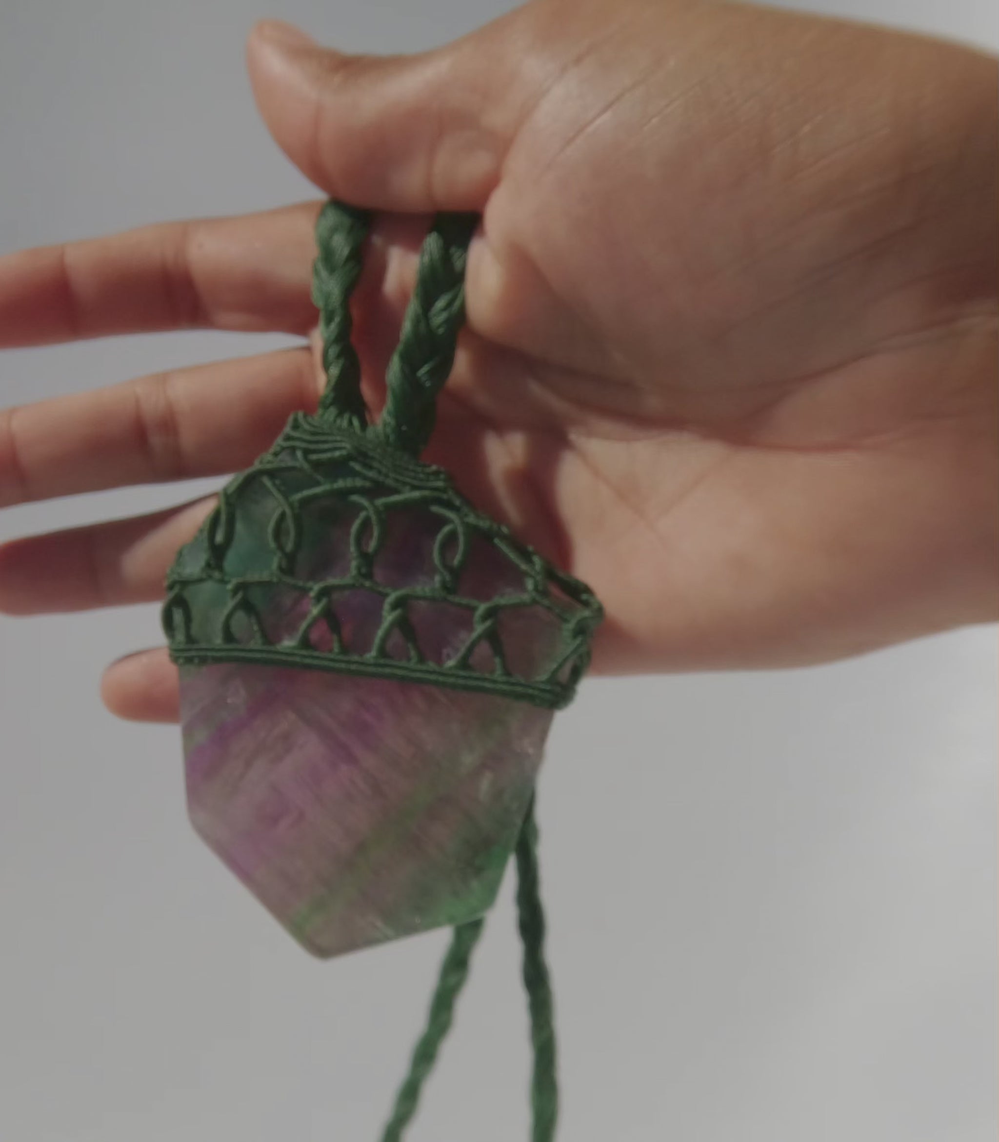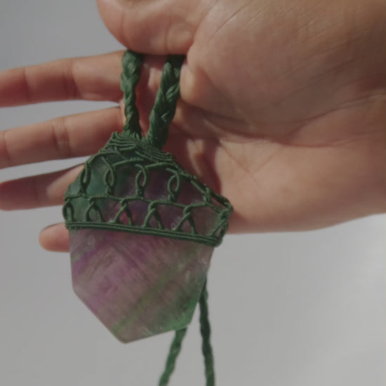 Embrace the harmonious energy of this one-of-a-kind handmade necklace, featuring a polished natural fluorite stone showcasing beautiful green and purple shades, wrapped carefully with rich dark green waxed macramé thread. This striking statement piece combines meticulous artisan work with deep spiritual significance.