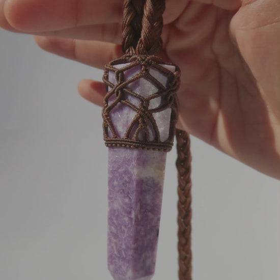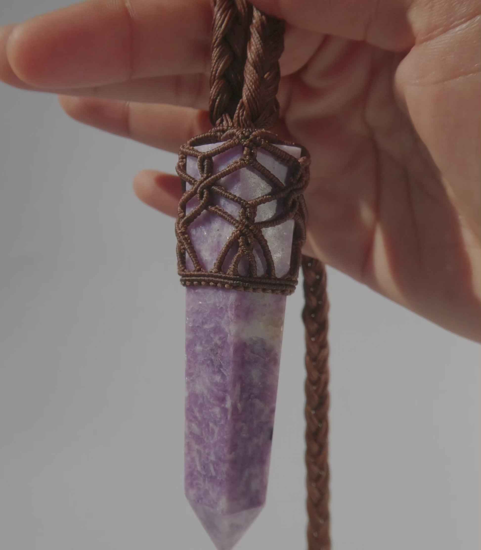 Step into a new chapter of your journey with this unique handmade necklace, featuring a polished lepidolite point pendant delicately wrapped in rich brown waxed macramé thread. Crafted with meticulous artisan skill, this bold yet elegant statement piece channels powerful spiritual energy to support your growth and healing.