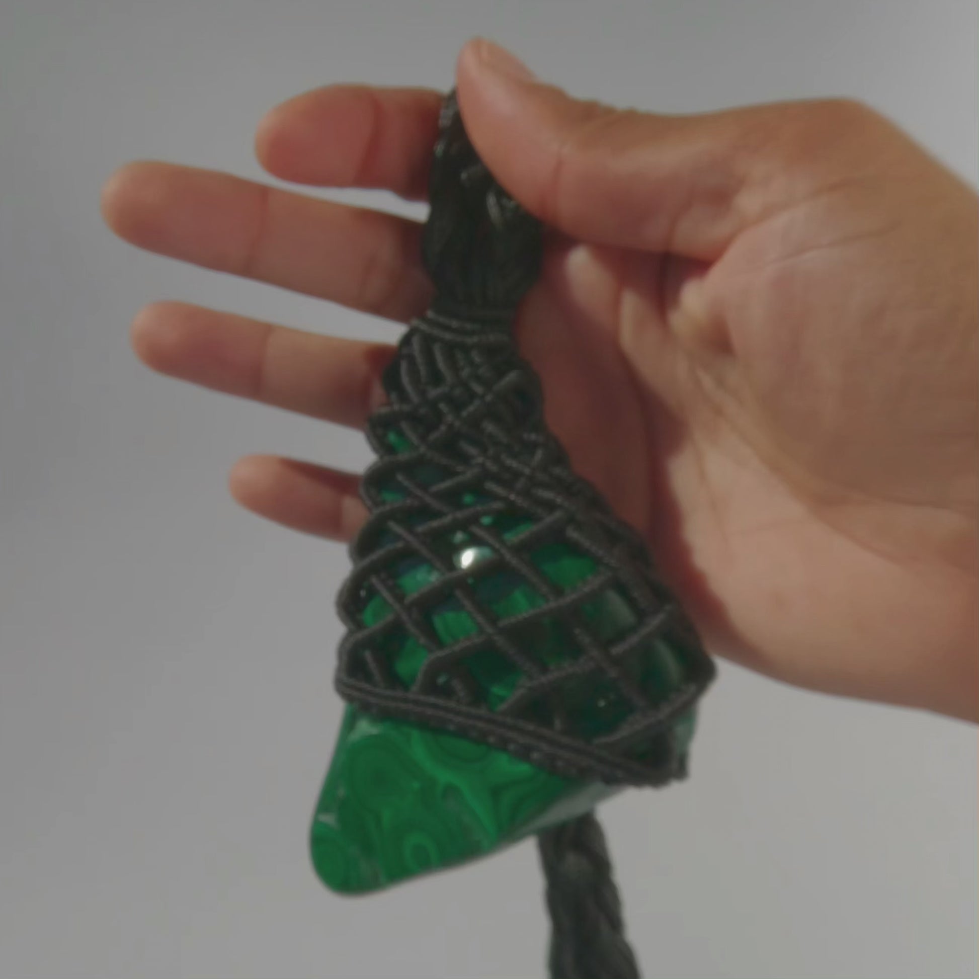 Make a striking impression with this unique handmade necklace, featuring an extra-large, irregularly-shaped polished malachite stone, intricately wrapped with durable black waxed macramé thread. This bold statement piece is crafted with detailed artisan skill, blending natural beauty with powerful spiritual energy.