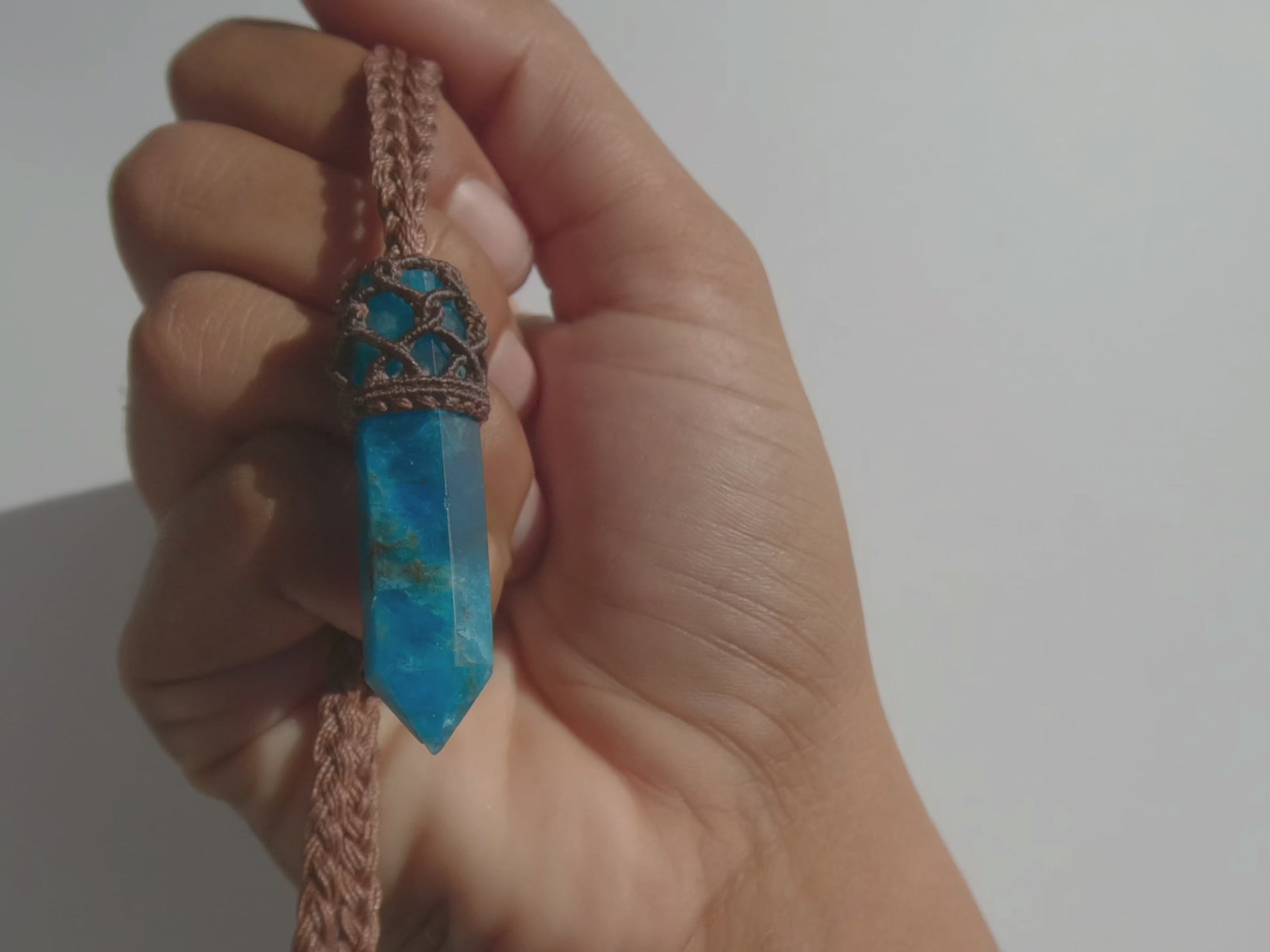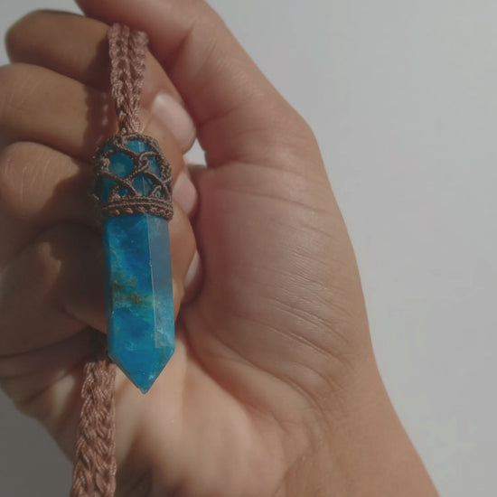 This mini handmade apatite necklace features a vivid blue apatite crystal point, securely held in an intricate macramé wrap and suspended from a braided cord. Designed at approximately half the size of my larger necklaces, this piece offers a refined, understated way to work with apatite’s uplifting and clarifying energy.