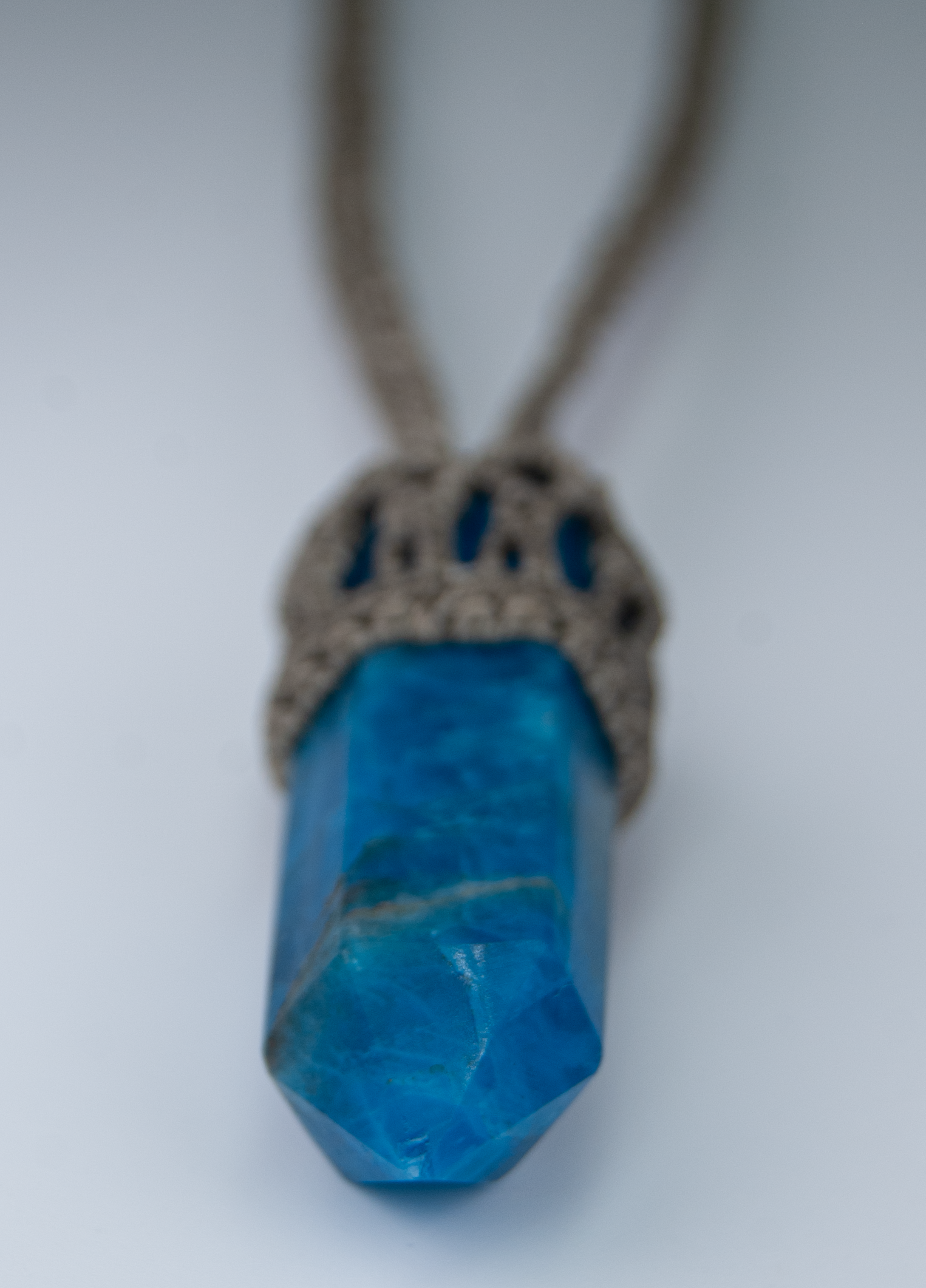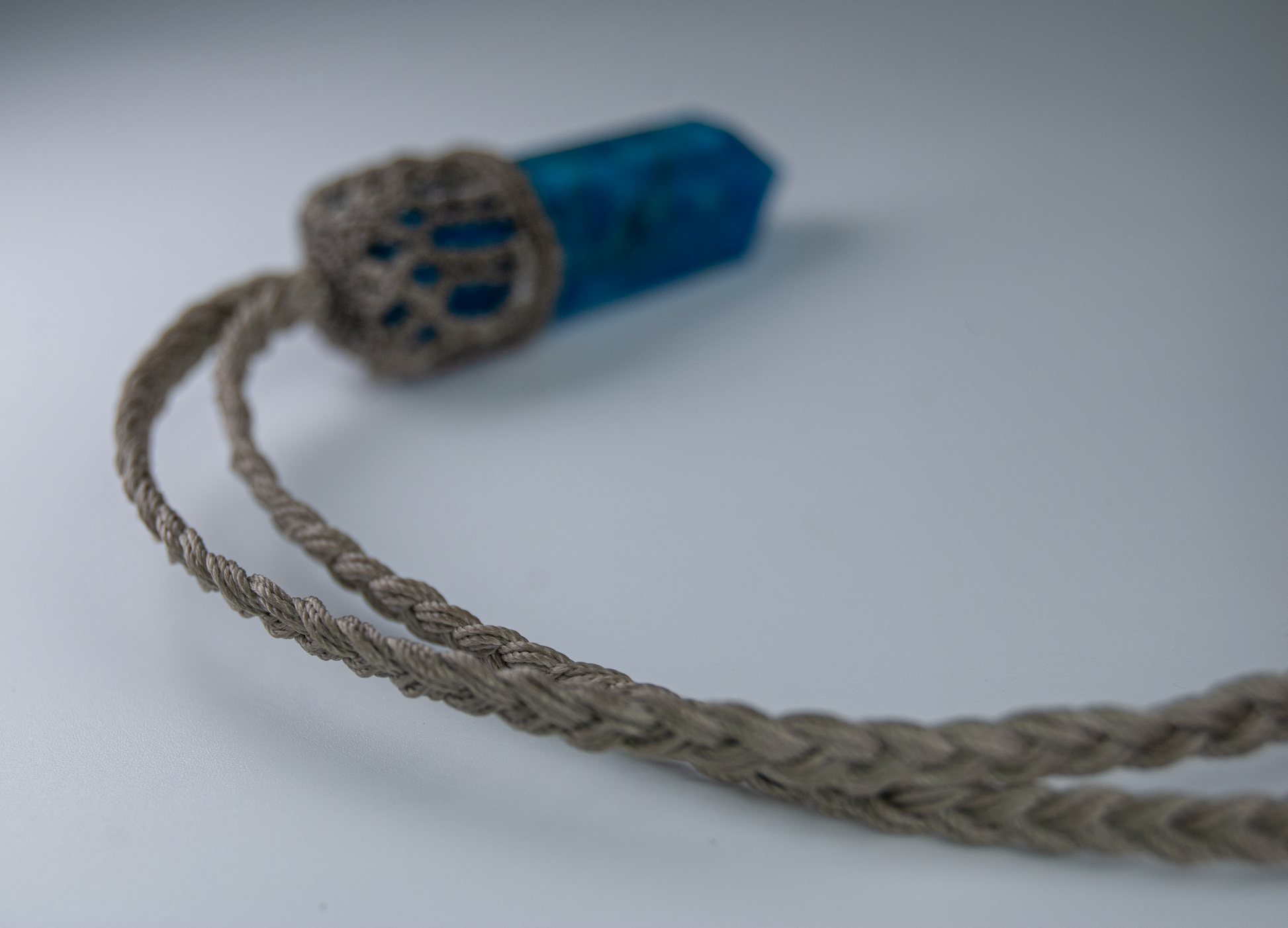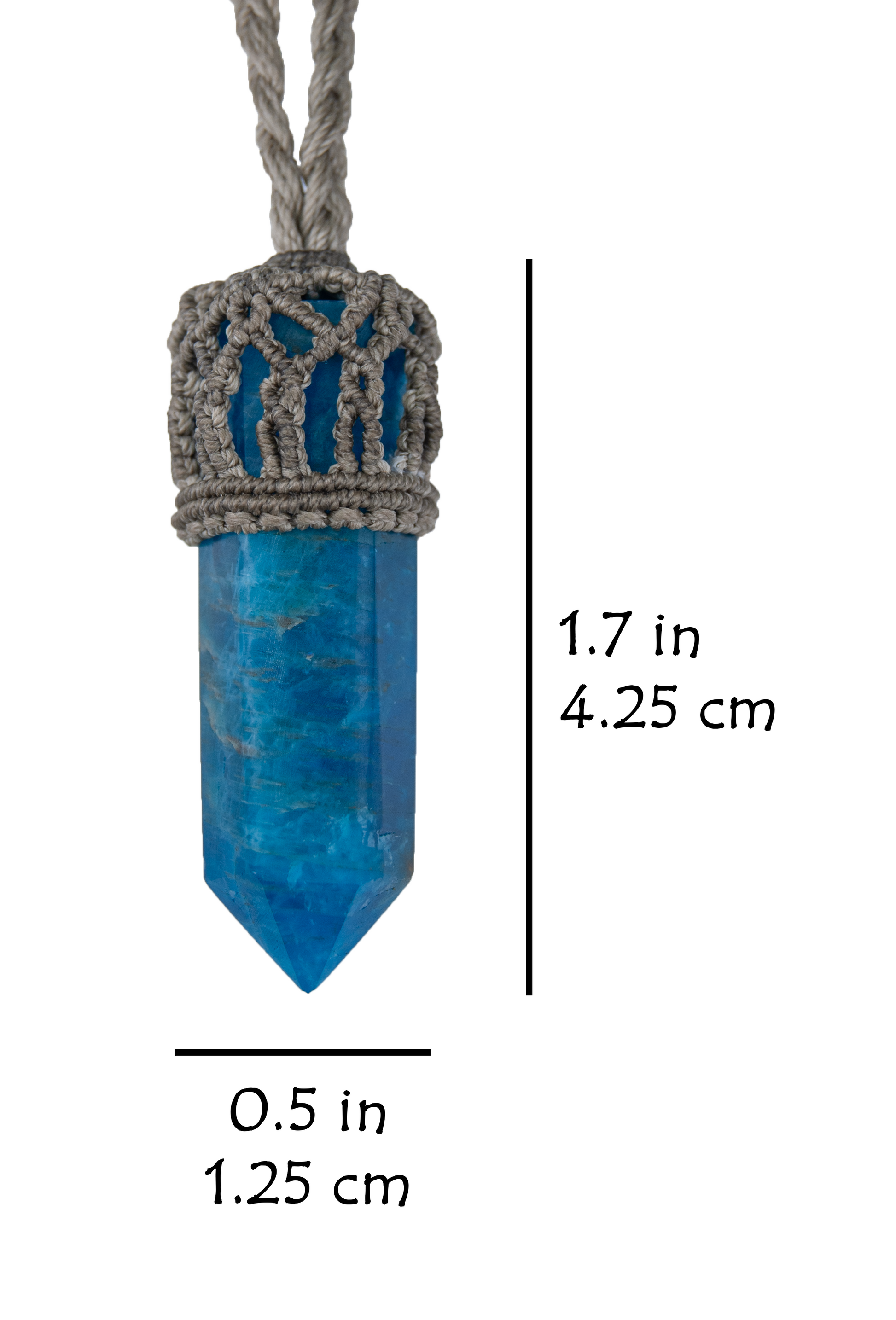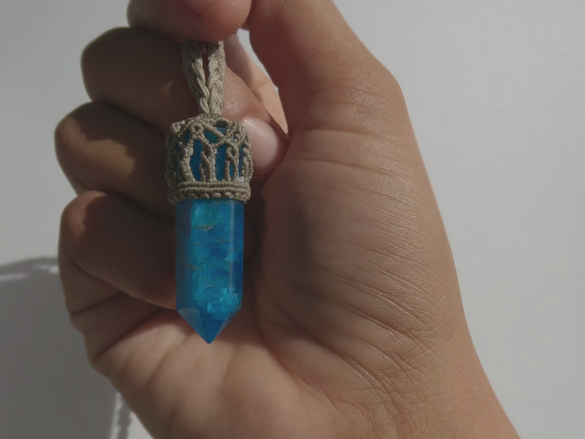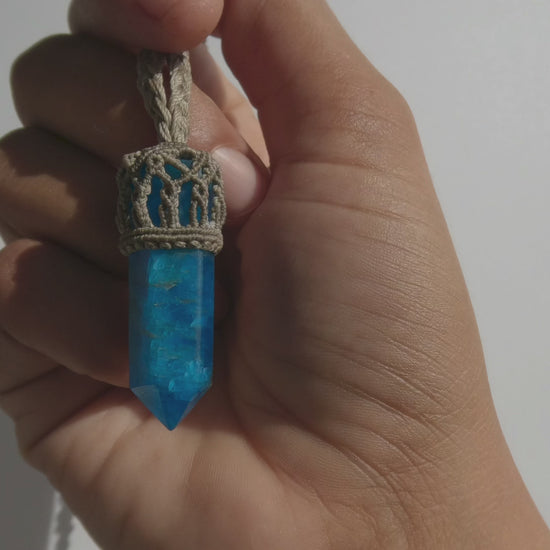 - This mini handmade apatite necklace features a naturally vibrant blue apatite point, carefully wrapped in an intricate macramé setting and suspended from a braided cord. Smaller in scale than my statement talismans, this piece offers a subtle, lightweight way to carry apatite’s energizing presence close to the body.