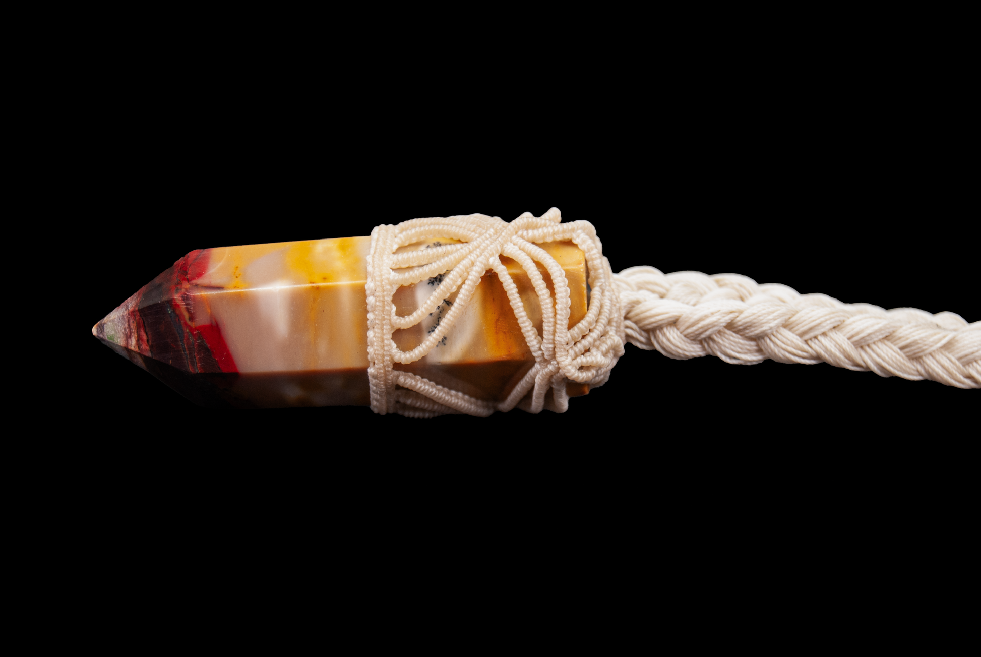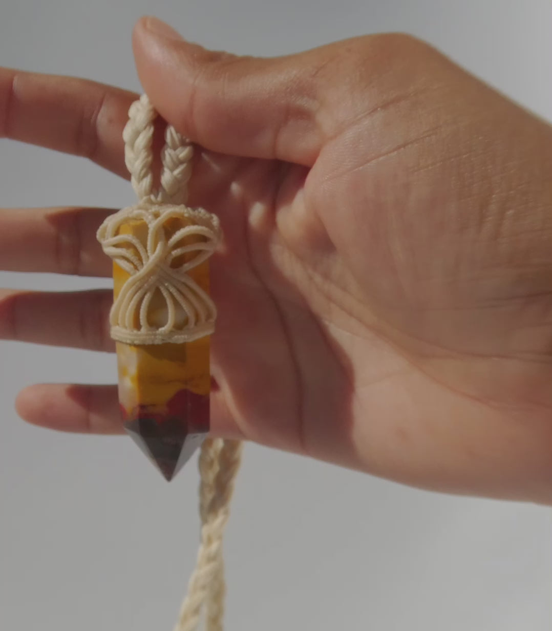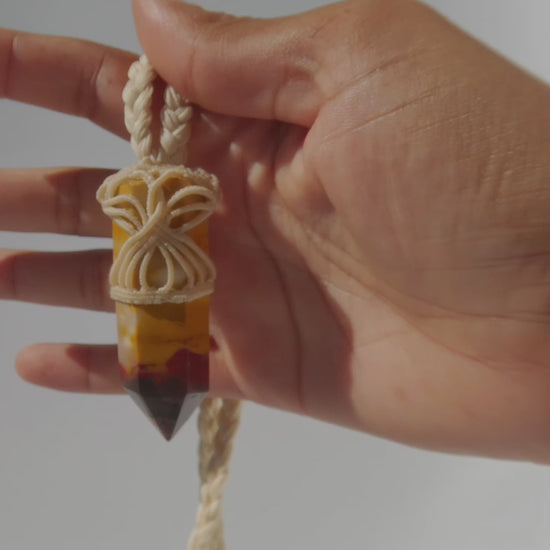 Embrace the grounded, vibrant energy of this unique handmade necklace, featuring a natural Mookaite point pendant wrapped in durable waxed macramé thread. This piece is crafted with intricate artisan skill, making it a bold and beautiful statement that’s truly one-of-a-kind.