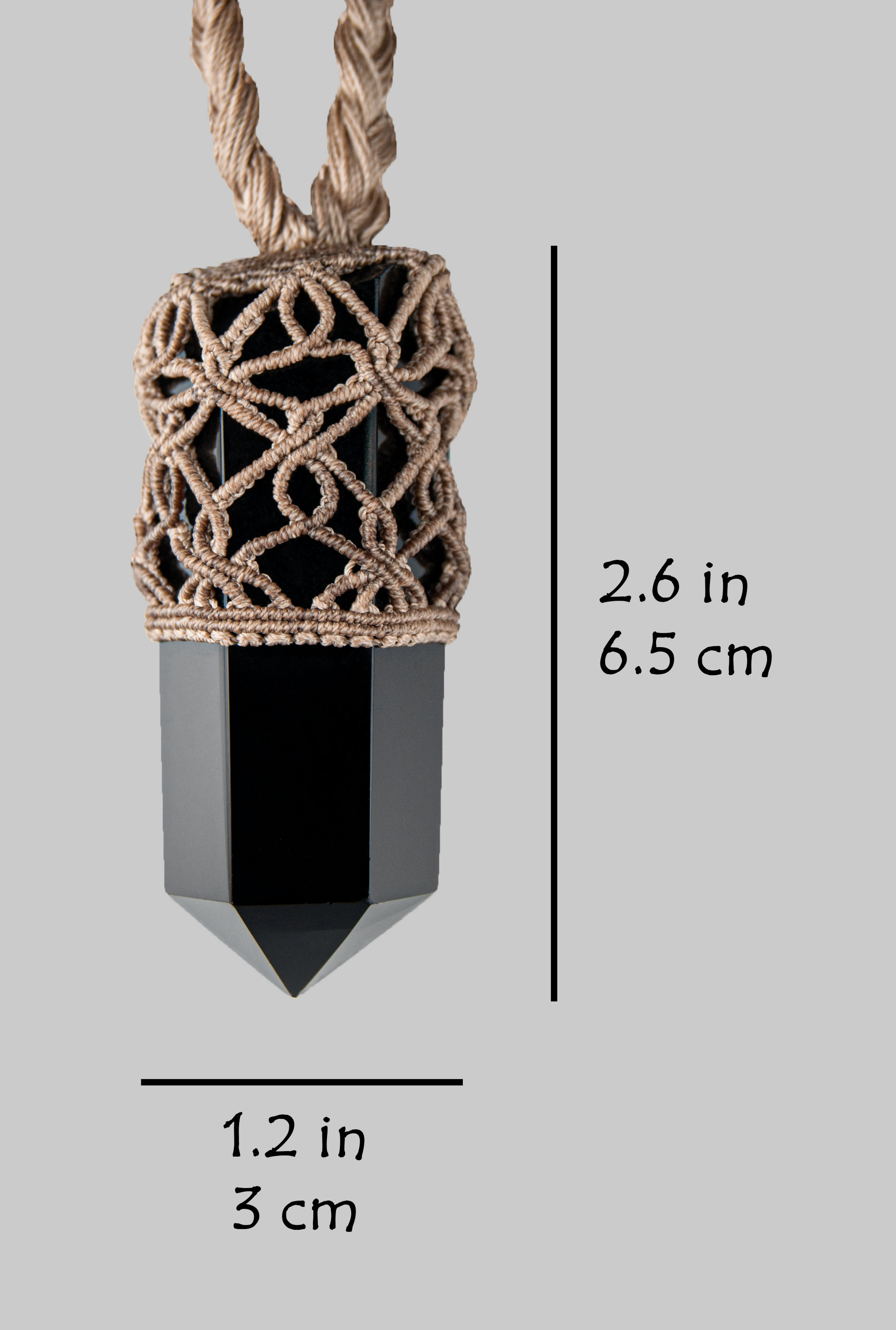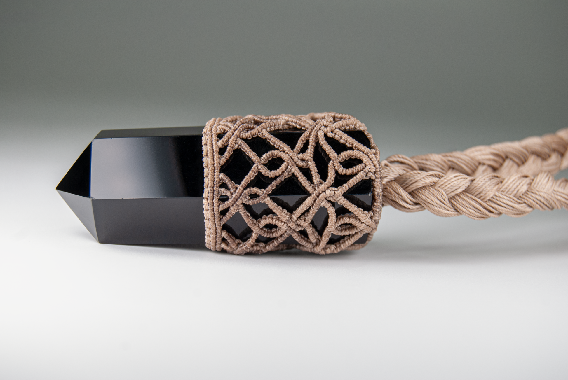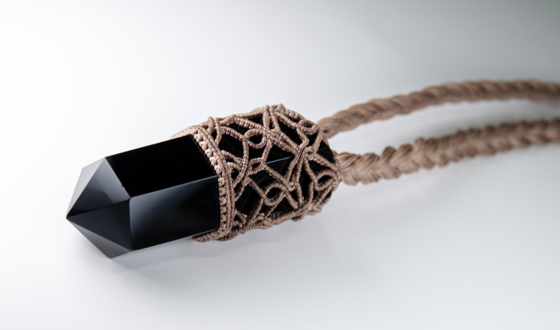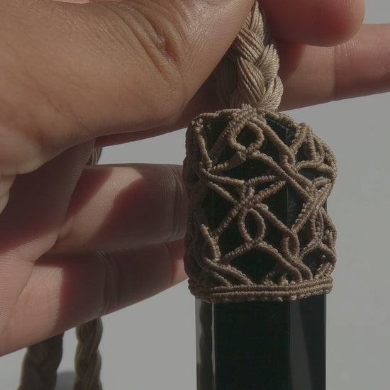 Step into your power with this handcrafted obsidian talisman, featuring a sleek black crystal point wrapped in intricate, durable waxed macramé. Each knot is tied with focused intention, creating an elegant woven pattern that highlights the stone’s reflective surface and sharp geometric form. This piece is bold, protective, and deeply grounding—crafted to support strength, inner stability, and energetic resilience.